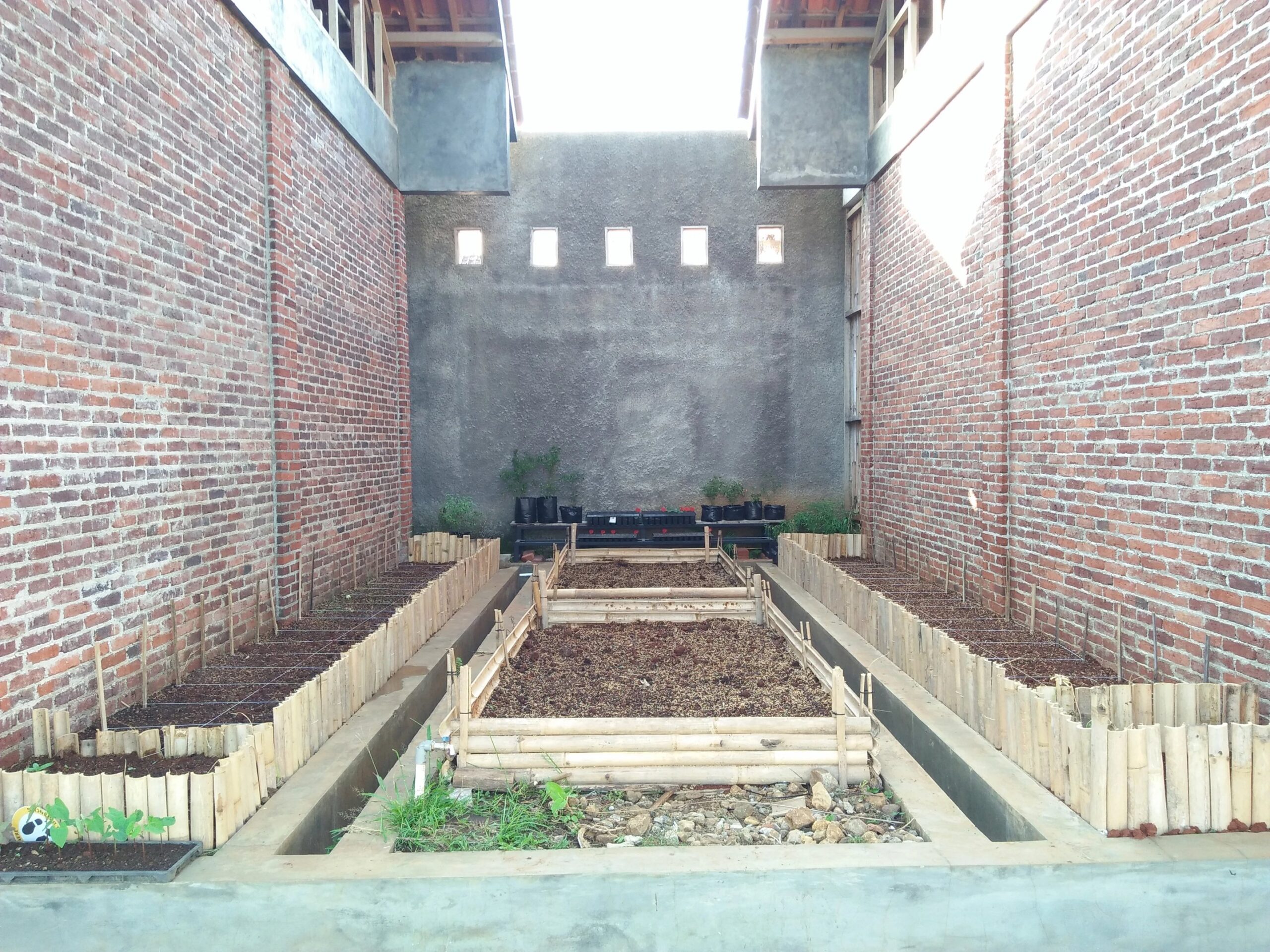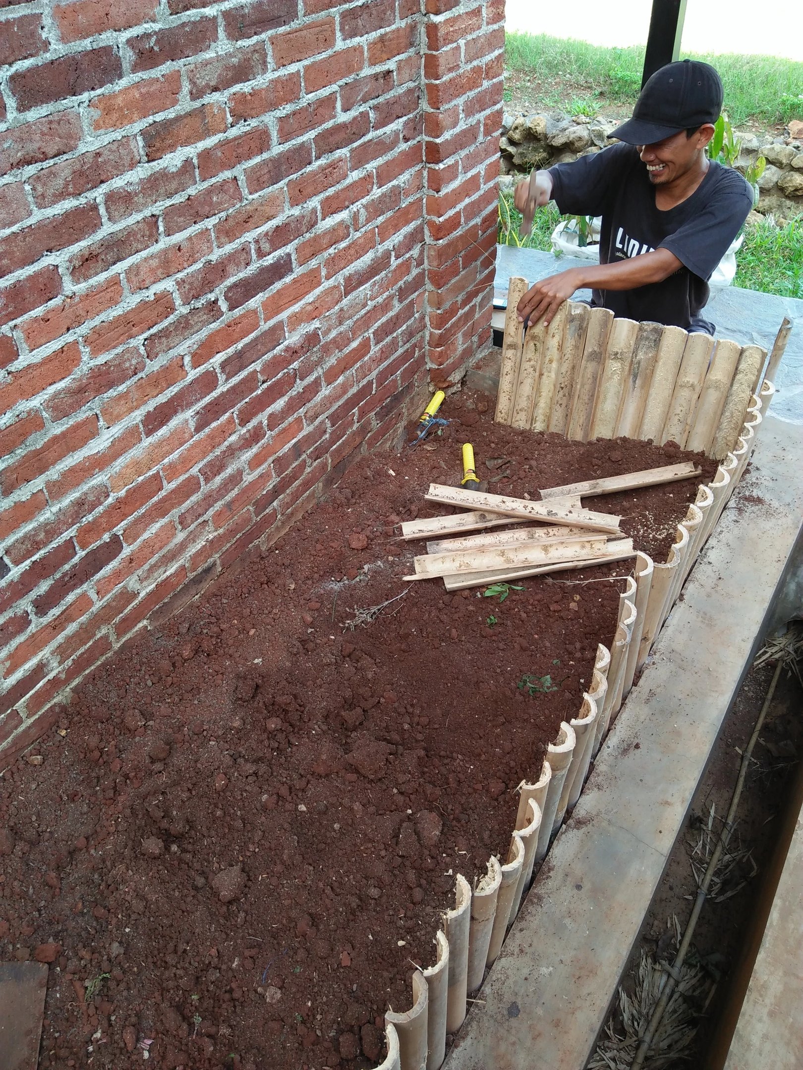 (Proses pembuatan raised bed garden dengan menggunakan bambu bekas pembangunan sekolah. Raised bed kemudian diisi dengan media tanam tanah, pupuk kandang, dan sekam bakar dengan perbandingan 1:1:1.)